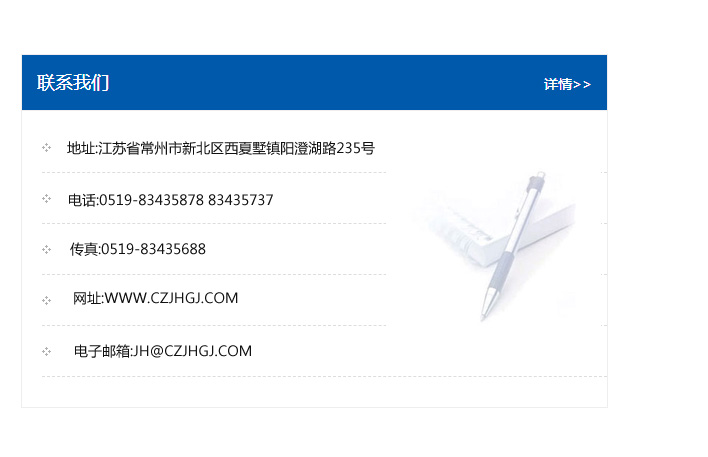 地址:常州市新北區(qū)友邦商務(wù)大廈1幢16、17層  電話:0519-85101652  傳真:0519-85112595  郵編:213022  網(wǎng)址:www_cz-jiayue_cn.mmcsgreen.com  郵箱:xiajifengaa@163.com